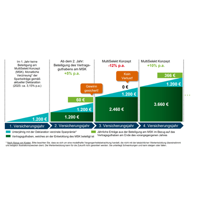 Maßgeblich für die Wertentwicklung Ihres individuellen Versicherungsvertrages sind die vertragliche Vereinbarung nebst Versicherungsbedingungen. Möchten Sie die aktuelle Wertentwicklung Ihres individuellen Vertrages wissen? Dann nutzen Sie bitte die auf Ihren Vertragsunterlagen angegebenen Kontaktdaten oder wenden Sie sich an Ihre Ansprechpartnerin o. Ihren Ansprechpartner vor Ort.